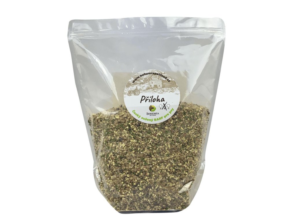 B príloha je zostavená tak, aby ste už nemuseli pridávať žiadne ďalšie nutričné doplnky. Stačí len pridať čerstvé alebo varené mäso, vnútornosti či naše mäsové konzervy. Príloha spĺňa optimálne hladiny bielkovín, minerálov, vitamínov a najmä zdravých tukov zo semien, orechov a kozieho mlieka, ktoré je priamo nabité prospešnými látkami pre psov.